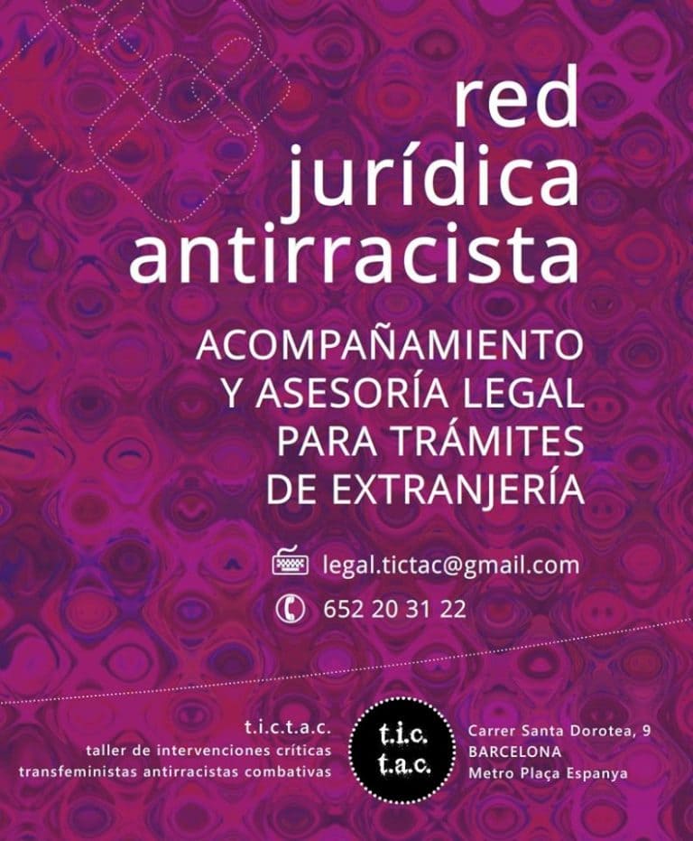 - Es primordial asesorarse con los colectivos de apoyo a las personas migrantes. La Red Jurídica Antirracista es una iniciativa colectiva de acompañamiento y asesoría legal para trámites de extranjería, organizada por t.i.c.t.a.c. (taller de intervenciones críticas transfeministas antirracistas combativas). Cuenta con la colaboración de compañerxs abogadxs y juristas y se focaliza en los trámites de regularización de papeles por arraigo, reagrupación familiar, matrimonio o pareja de hecho. También atienden trámites relacionados con renovaciones y residencia de menores. Se puede reservar cita escribiendo al correo electrónico: